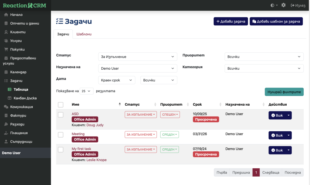 Управлението на персонал не е лесна отговорност. Ето защо ReactionCRM Ви позволява лесно да възлагате задачи на Вашите служители. Системата изпраща напомняния за незавършени задачи и Ви позволява да оптимизирате работния си процес чрез използването на шаблони за задачи.