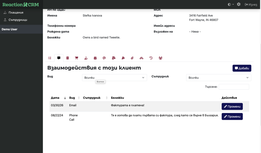 За по-задълбочени прозрения и по-добри взаимоотношения с Вашите клиенти, ReactionCRM предоставя възможност за съхраняване на историята на взаимодействията. Прегледът на предишните Ви взаимодействия с даден клиент ще Ви помогне да бъдете по-добре подготвени за следващото.