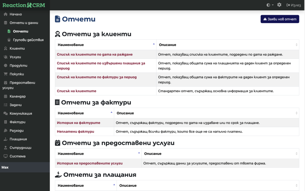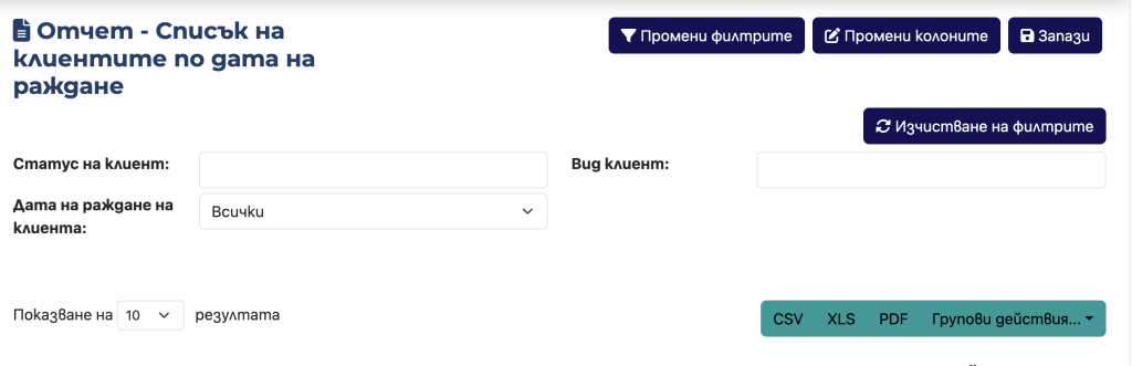 След като създадете перфектния отчет за Вашите нужди, можете да запазите избраните филтри и колони, което Ви спестява необходимостта да създавате отчета наново всеки път. Всеки запазен отчет винаги включва най-новите данни от системата, така че можете да бъдете сигурни, че информацията е актуална и точна.