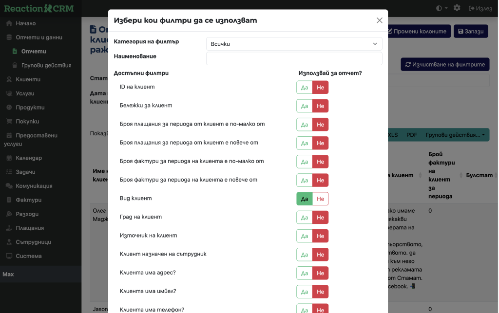 Конструкторът на отчети предоставя и гъвкаво филтриране на резултатите. Широк набор от филтри Ви позволява бързо да сегментирате, за да получите необходимите данни, и дава възможност за повече креативност в сравнение с други системи, които Ви принуждават да използвате само предварително дефинираните отчети, които те смятат за важни.