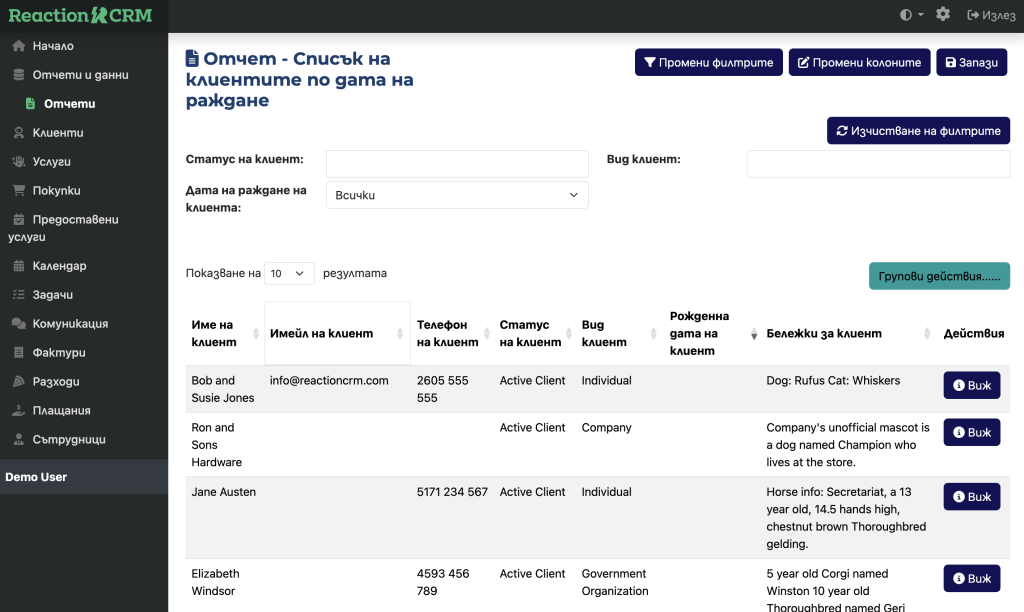 Всеки отчет може да бъде експортиран в CSV, Excel или PDF само с едно кликване. Освен това, докато преглеждате отчет, груповите действия Ви позволяват бързо и лесно да добавяте взаимодействия, задачи, писма, тагове и други към всеки от резултатите в отчета.