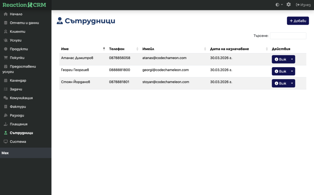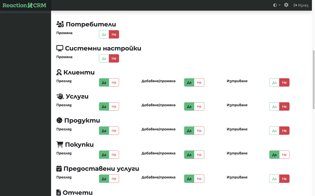 Задавайте, променяйте и премахвайте права за достъп за всеки потребител. ReactionCRM Ви дава пълен контрол да избирате каква информация може да преглежда, редактира или изтрива всеки потребител в системата.