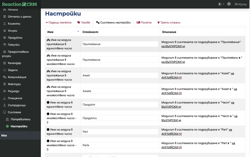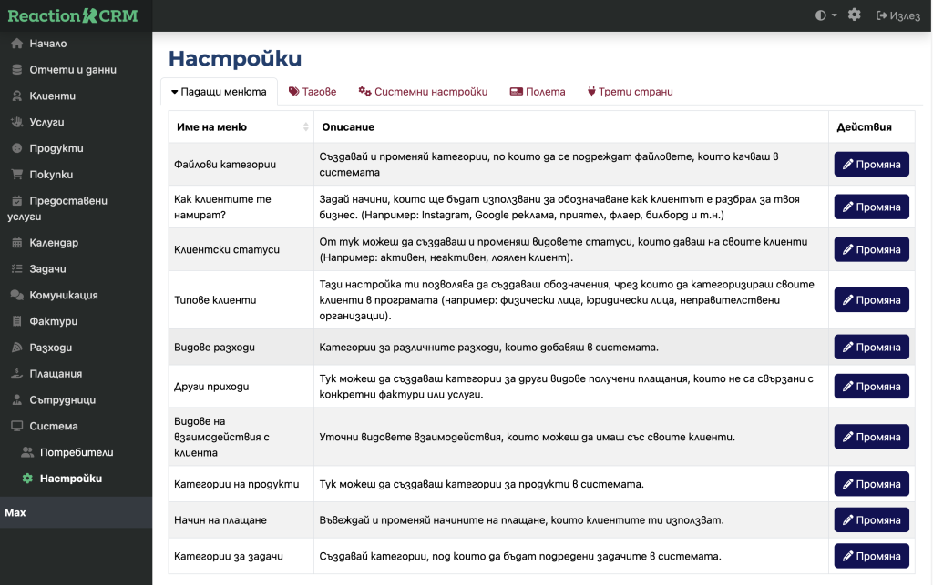 ReactionCRM предоставя гъвкавостта да променяте падащите менюта в програмата според уникалните нужди на Вашия бизнес. Например, можете да модифицирате падащите менюта за „Категории разходи“, „Типове клиенти“, „Методи на плащане“ и много други.