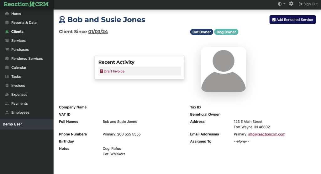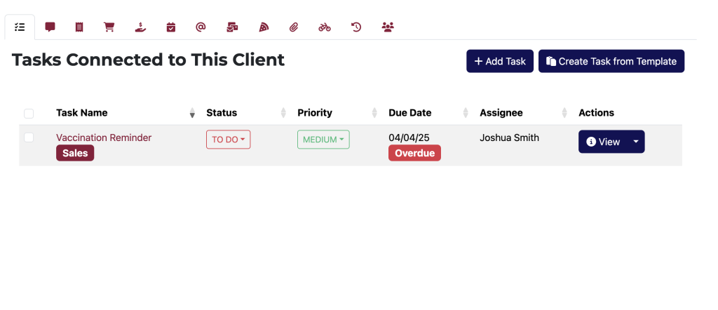 From the client's profile, you can create tasks, log purchases, issue invoices, send emails, add received payments, and much more.