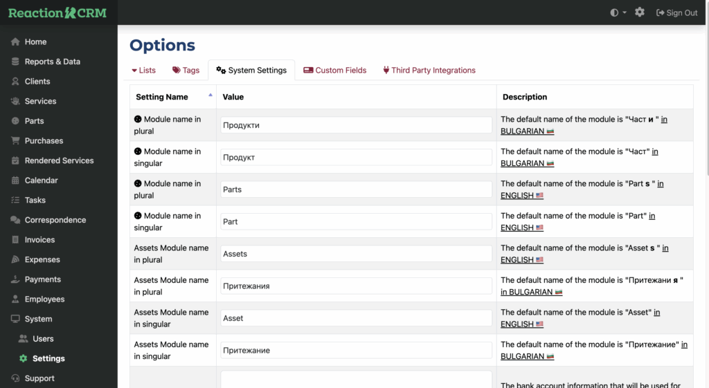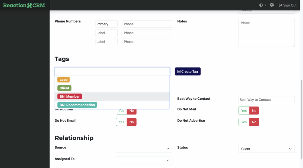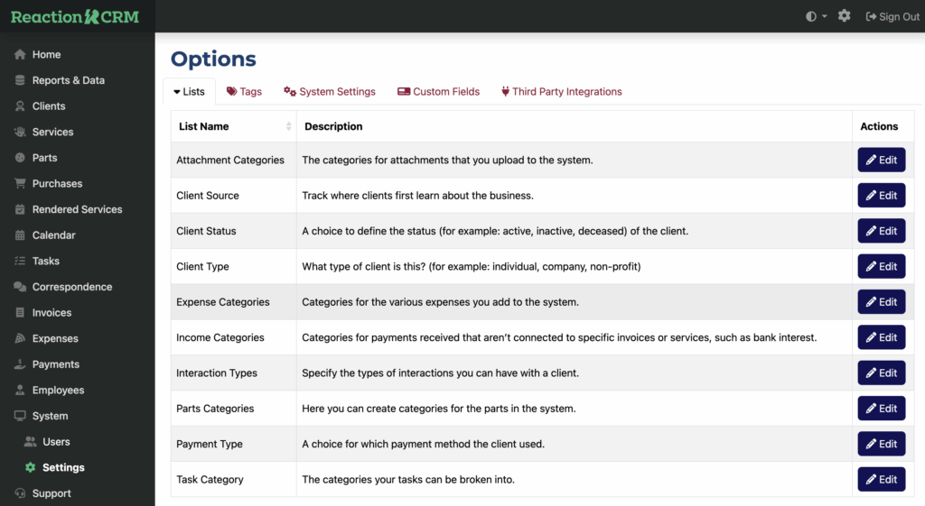 ReactionCRM provides the flexibility for you to change the drop-down menus in the program according to your business’ unique needs. For example, you can modify drop-down menus for "Expense Categories", "Client Types", "Payment Methods", and many, many others.